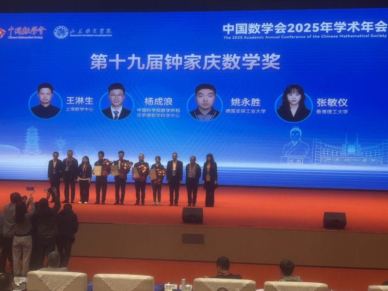 10月16日至19日,中国数学会2025年学术年会在山东滨州召开。开幕式上同步举行华罗庚数学奖、陈省身数学奖和钟家庆数学奖颁奖。我校数学研究院2019级校友姚永胜荣获第十九届钟家庆数学奖。